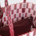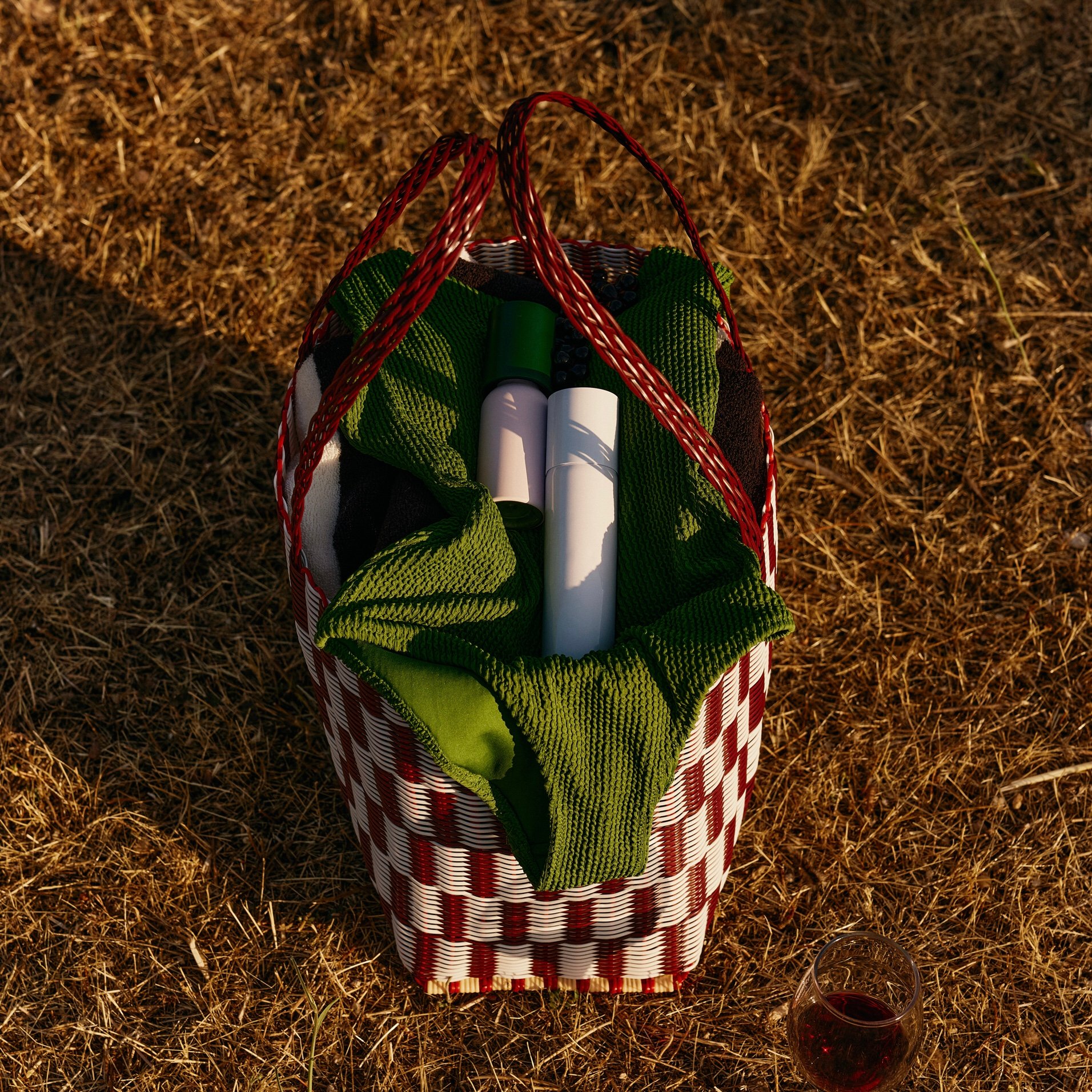 Each basket bag is made from 100% HDPE plastic strands, combining virgin and recycled materials. HDPE (high-density polyethylene) is one of the most widely recycled plastic polymers worldwide and is known for its strength and longevity. This material makes our basket bags waterproof, lightweight, UV-resistant, and extremely durable.